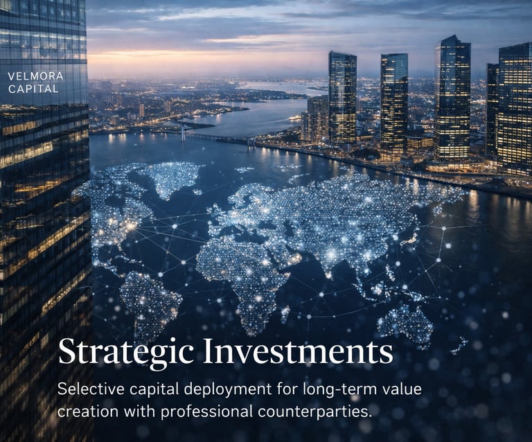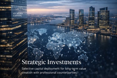 Velmora Capital engages in selective strategic investment activities alongside Professional Clients and Eligible Counterparties, with a focus on long-term value creation and capital discipline. Investment decisions are informed by rigorous fundamental analysis, conservative risk assessment, and a clear evaluation of structural and governance considerations.